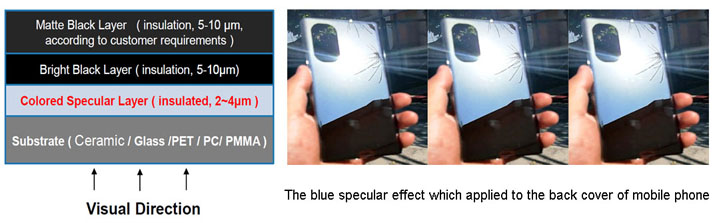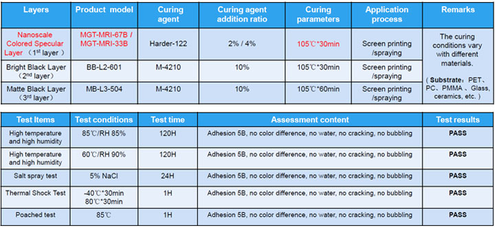 Nanoscale Colored Specular Ink ( Model:MGT-MRI-67B / MGT-MRI-33B) is a blue high-gloss specular ink suitable for surfacetreatment and decoration of 3C electronic products, householdappliances, smart home products, high-enddecorative parts, control panels and craft gifts andother fields. It has excellent reliabilityperformance and excellent adhesion to most organicmaterials and inorganic materials such as glass and ceramics. It has the advantages of screen printing, spraying,double 85 test does not fall off,conforming to 3C certification, can bematched to shade the black background, can be hot bendingprocessing after forming and does not destroy the mirror effect and so on. Theproduct can be used in the glass of the back cover of mobile phone and otherparts that need specular effects, replacing thetraditional electroplating process, greatly saving the cost. After screenprinting, this product has excellent blue specular reflection effect on PET,PC, PMMA, glass and ceramics; At the same time, the product can be used forspraying processing after reasonable dilution, after high temperature tensile,the whole appearance is no cracking, no discoloration; It retains excellentappearance after high temperature and high humidity test.