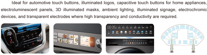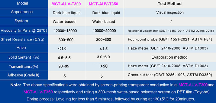 Screen printing transparent conductive ink (UV-Resistant Type) is a water-based ink developed based on conductive polymer (PEDOT:PSS). It offers high transparency and excellent adhesion, making it suitable for printing large-area and high-precision (100μm) transparent electrodes on substrates such as PET, PC, PMMA, PI, diffusion films, and glass. The ink exhibits no rainbow patterns, orange peel effects, pinholes, or shrinkage. The MGT-AUV-T300 and MGT-AUV-T350 models are specifically designed for applications requiring prolonged exposure to sunlight, such as automotive touch switches and washing machine touch panels, providing outstanding resistance to ultraviolet ( UV and IUV ) radiation.