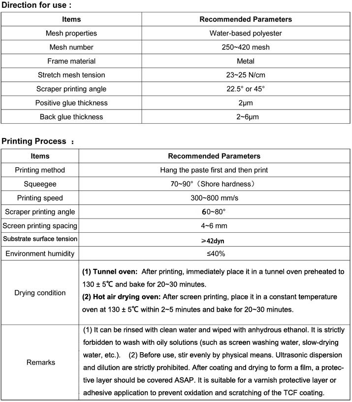 1. The remaining ink on the screen plate can be reused. The recovered ink should be stored separately. The number of recoverings should be less than 3 to avoid ink contamination. Once opened, it is important to close the package promptly to prevent water evaporation, which may lead to the formation of insoluble particles.