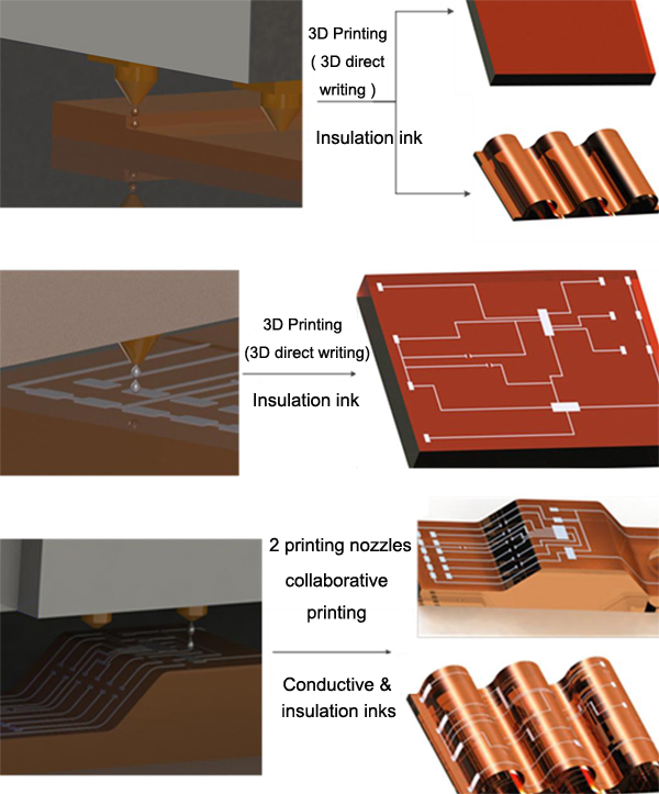 MGT-3D-P3050 is a nanosilver conductive ink specially developed for extrusion 3D printing or direct 3D writing. This conductive ink is based on the characteristics of nanosilver with small fineness, excellent rheological properties, light-curable, and strong adhesion to various insulating materials. It is suitable for various extrusion methods and direct writing methods including peristaltic pump extrusion heads, screw pump extrusion heads, piston syringe extrusion, and pneumatic pump extrusion heads. When combined with 3D-printed insulating materials, it can be used to manufacture circuit boards with various special structures such as multi-layer structures, irregular shapes, curved surfaces, and three-dimensional structures, etc.