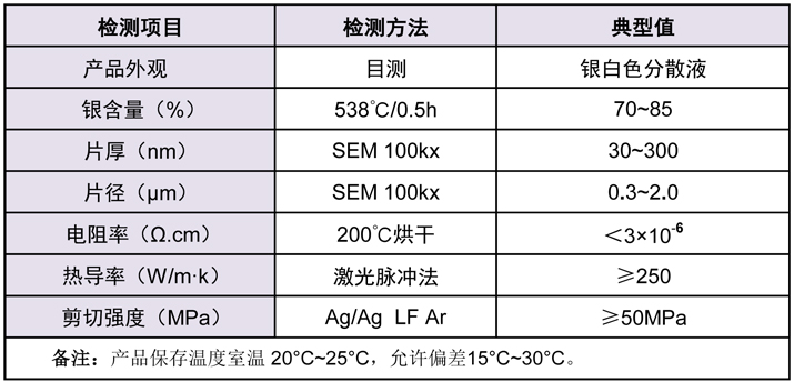 银纳米片分散液 (Silver Nanoflakes Suspension) 是将用纳米技术合成的银纳米片分散在特定溶剂中制成的分散液,因为纳米尺寸的低熔点效应使其可在较低温度(<300℃)实现烧结,烧结后得到的膜层熔点接近块体银的熔点(960℃),远高于烧结温度和工作温度,即可实现“低温烧结,高温服役”。银纳米片低温烧结后在构成器件的各种组件之间生成高导热性和高导电性的粘接层,具有较高的剪切强度和适宜的热膨胀系数,可在长期高低温循环下不失效,具有高可靠性。