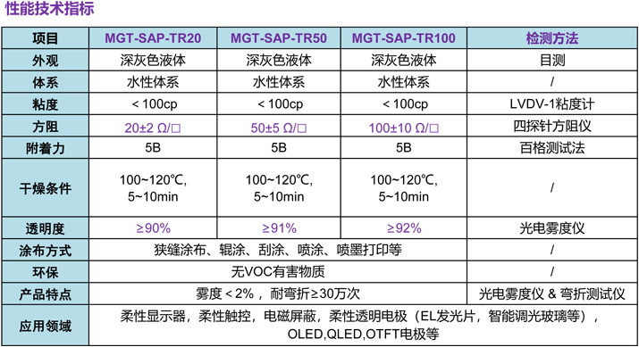 水性透明导电涂布墨水( MGT-SAP-TR20 / TR50 / TR100 ) 是基于PEDOT:PSS与银纳米线(AgNWs)的复配透明导电涂布墨水, 主要应用于电子工业中。其中 PEDOT:PSS 是一种含有聚阴离子的替代型聚噻吩离子键聚合物复合物,具有独特的导电性、化学稳定性、高透明性以及柔韧性等特点。随着柔性显示器、柔性照明、柔性传感器、柔性太阳能电池等柔性电子产品的兴起和发展,产业界对柔性高透明高导电的墨水和透明导电电极等材料具有迫切的需求,同时也有较高的品质要求。