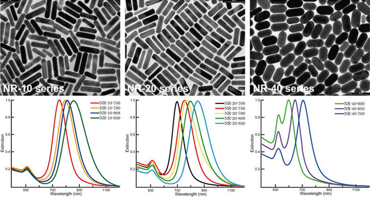 Mogreat company provides high quality gold nanorods with different plasmonic resonance wavelengths. The plasmonic peak wavelengths of the gold nanorods cover from 550 to 850 nm. The peak wavelength deviations for each type of product are precisely controlled within±5 nm. Besides, we provide nanorods of different sizes ( Diameter=10, 20 and 40nm, respectively ), satisfying the requirements of various applications, such as photothermal conversion, bioimaging, and optical signal enhancement, etc. All the products provided by Mogreat company are dispersed in deionized water and the concentration of the surfactant CTAB is less than 0.1%. The products are dispersed evenly in water and are very stable. They can be kept for a few months without any precipitation.