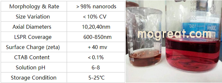 Mogreat Technologies Co.,Ltd. provides high purity, monodispersity and small size Gold NanoRods ( GNR ) and its derivatives. Every batch of products are through the precise chemical steps synthesis, and characterization with independence of visible and infrared extinction spectra. Mogreat company guarantees that the customer purchased in different batches of the same type of product has good repeatability and consistency. Gold nanorods products can be widely used in cosmetic, information, life science and photonics, physical chemistry and other fields.
