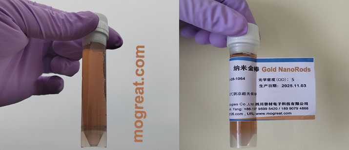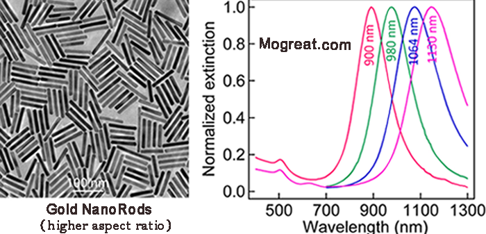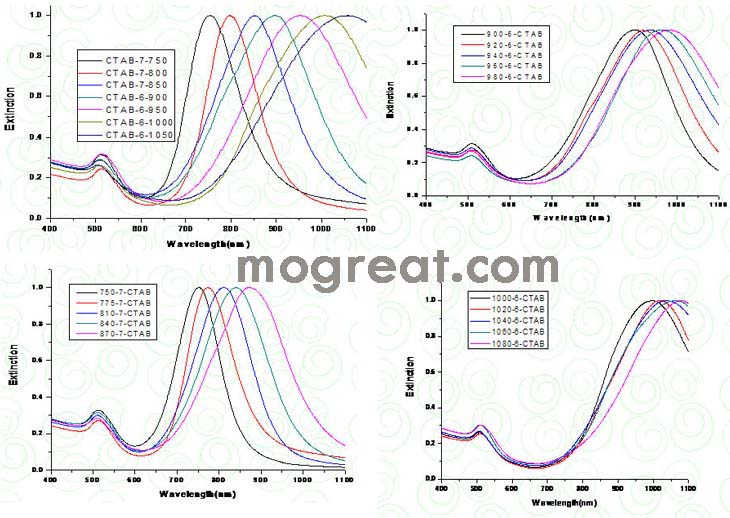 Mogreat company provides Gold NanoRods ( GNR ) with high purity and monodispersity and small sizes ( 6~9nm in diameter). Their longitudinal surface plasmonic resonances ( LSPR ) cover a broad wavelength range of 750-1130 nm. The quality of each batch of GNR sold has been precisely controlled and the products are independently examined by UV-Vis-Nir extinction spectroscopy before storing and delivery. Mogreat company sincerely promises that the products you bought with the same label vary only slightly from batch to batch.Mogreat company provides CTAB-, PEG-, PAA-, and Tinnin-capped Gold NanoRods uniformly dispersed in deionized water, which are quite stable at temperatures of 4~26°C and can be kept for a few months without any precipitation (except for the CTAB -capped ones) and size variation.