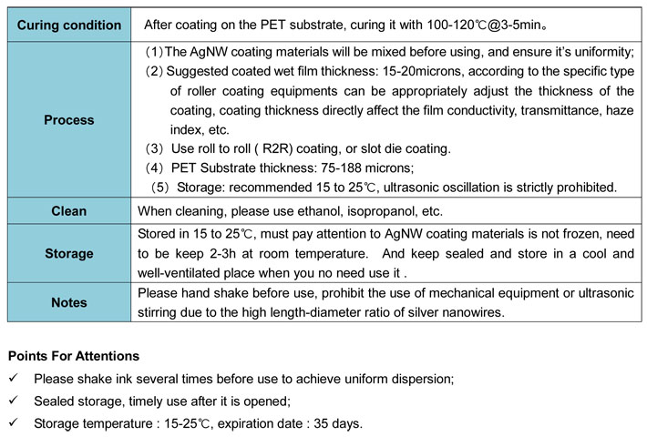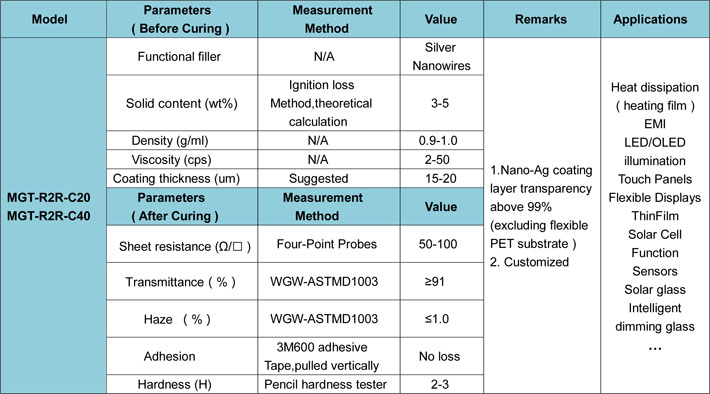 Mogreat Technologies Co.,Ltd, is specialized in supply of water-based conductive solution ( AgNW Coating Materials ) , which the critical and special material to manufacture the Nano-Ag transparent conductive Film ( AgNW TCF ). We can coat the materials on the surface of flexible PET or glass substrates through the Slot-die, Micro-garvure R2R ( roll to roll ) and other precision coating processes to forming a conductive film or conductive glass with good electrical conductivity, high transparency and low haze ( Surface Resistance < 100 Ω/□, Transparency ≥91%, Haze ≤1.0% ). It has significant advantages in the field of flexible and large size touch screens. AgNW coating material features: (1) Water-based and eco-friendly ; (2) Adhesion isbetter with substrates ; (3) Match better with Processes ; (4) Film-forming effect more excellent.