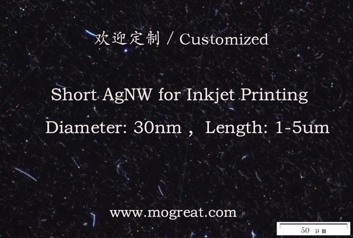 Mogreat Technologies Co.,Ltd. can mass produce and supply the Ultrashort AgNW / Nanorods for Ink-jet Printing. Diameter: 30~50nm, Length: 1~5um ( Diameter and Length are controllable ). Optional solvent: Deionized Water, Ethanol, Isopropanol; Optional concentration: 10mg/mL~90mg/mL ( Customized ) .