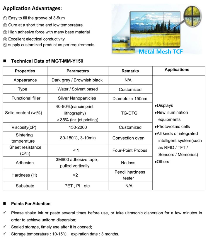 Mogreat Technologies Co.,Ltd. is a professional supplier of special Nano-Ag paste ( Model: MGT-MM-Y150 ) for metal-mesh technology. It's preferred nano-silver paste to manufacture large-size touch screens with metal-mesh Technology .