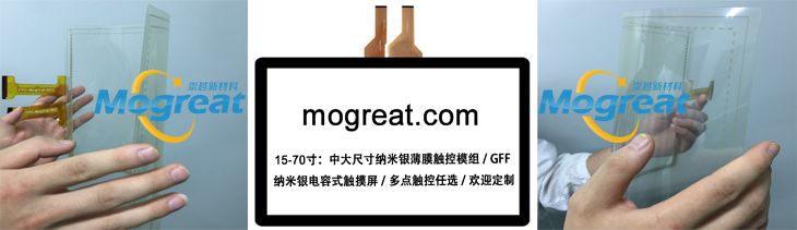 Silver nanowires based transparent conductive film with lower manufacturing costs and lower sheet resistance, is the best material to replace ITO. Mogreat Technologies Co.,Ltd. is professional supplier of the AgNW Film Sensor ( Model : MGT-AgNWF-SR-X'' ) , AgNW TCF based capacitive touch screens ( Model: MGT-TPS-X'' ) and other related products. Our company use full laser etching process to manufacture and supply 15-70''of nano-silver touch modules and capacitive touch screens. Meantime , we are providing customized nano-silver products and related solutions.