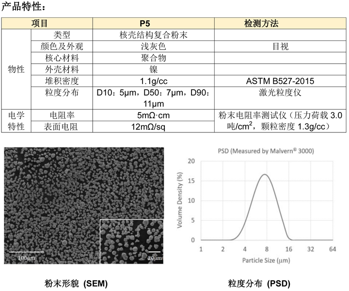 产品介绍:P5为聚合物芯镍包粉,属于核壳结构复合粉末,具有高导电性、重量轻、中等分散的粒度分布等特点,一般用于导电胶粘剂、导电垫圈、导电填料等领域,产品外观为浅灰色。