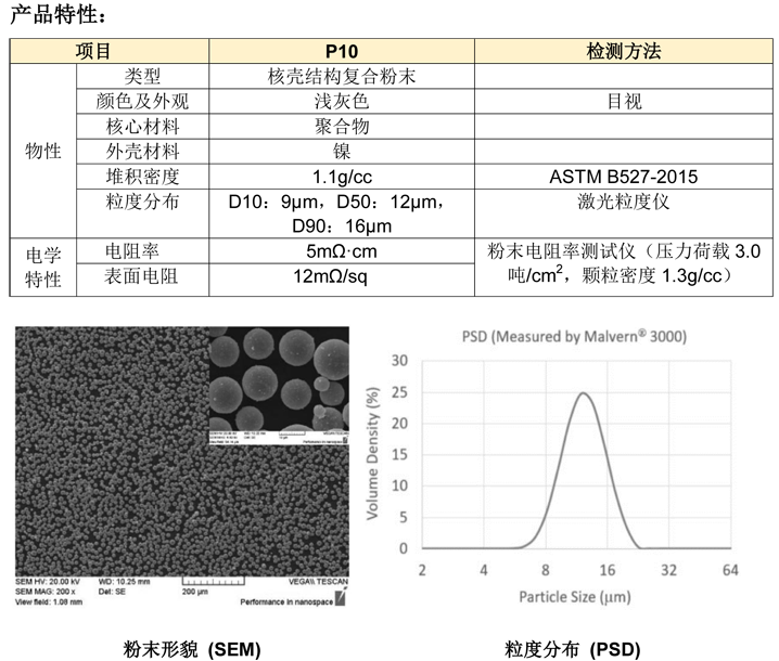产品介绍:P10为聚合物芯镍包粉, 属于核壳结构复合粉末,具有高导电性、重量轻、中等分散的粒度分布等特点,一般用于导电胶粘剂、导电垫圈、导电填料等领域,产品外观为浅灰色。