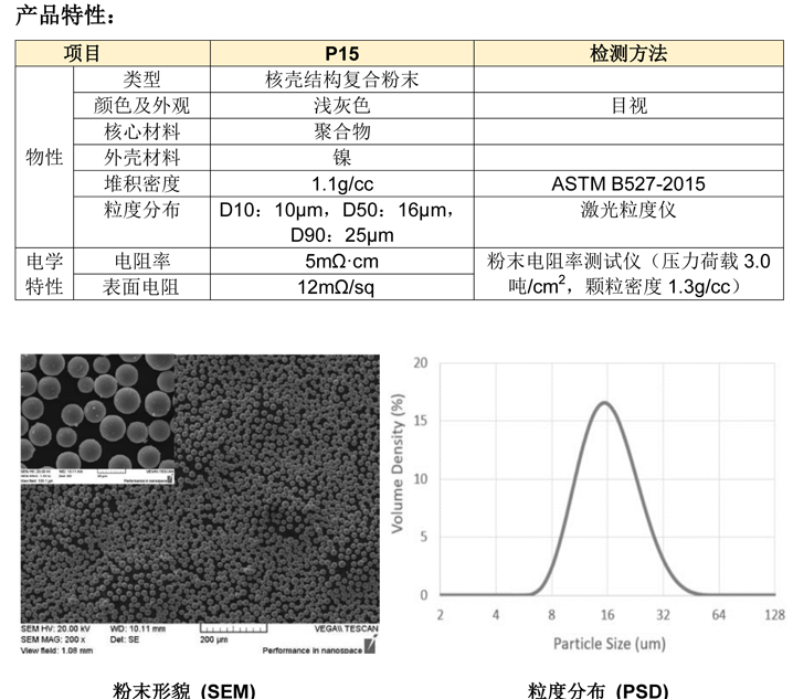 产品介绍:P15为聚合物芯镍包粉,属于核壳结构复合粉末,具有高导电性、重量轻、中等分散的粒度分布等特点,一般用于导电胶粘剂、导电垫圈、导电填料等领域,产品外观为浅灰色。