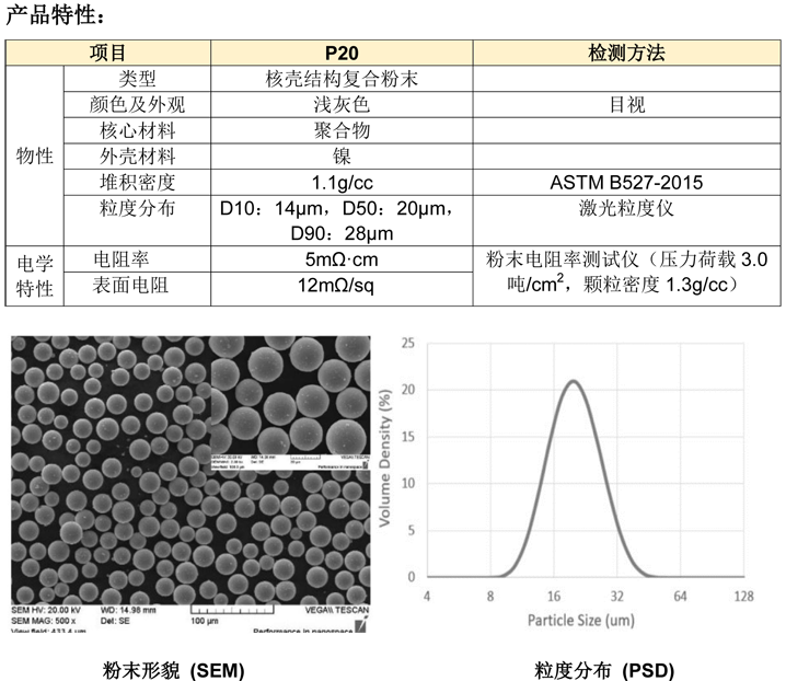 产品介绍:P20为聚合物芯镍包粉,属于核壳结构复合粉末,具有高导电性、重量轻、中等分散的粒度分布等特点,一般用于导电胶粘剂、导电垫圈、导电填料等领域,产品外观为浅灰色。