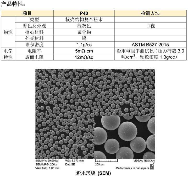 产品介绍:P40为聚合物芯镍包粉,属于核壳结构复合粉末,具有高导电性、重量轻、中等分散的粒度分布等特点,一般用于导电胶粘剂、导电垫圈、导电填料等领域,产品外观为浅灰色。