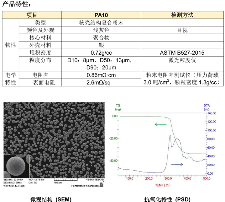 产品介绍:PA10为聚合物芯银包粉,属于核壳结构复合粉末,具有高导电性、重量轻、中等分散的粒度分布等特点,一般用于导电胶粘剂、导电垫圈、导电填料等领域,产品外观为浅灰色。