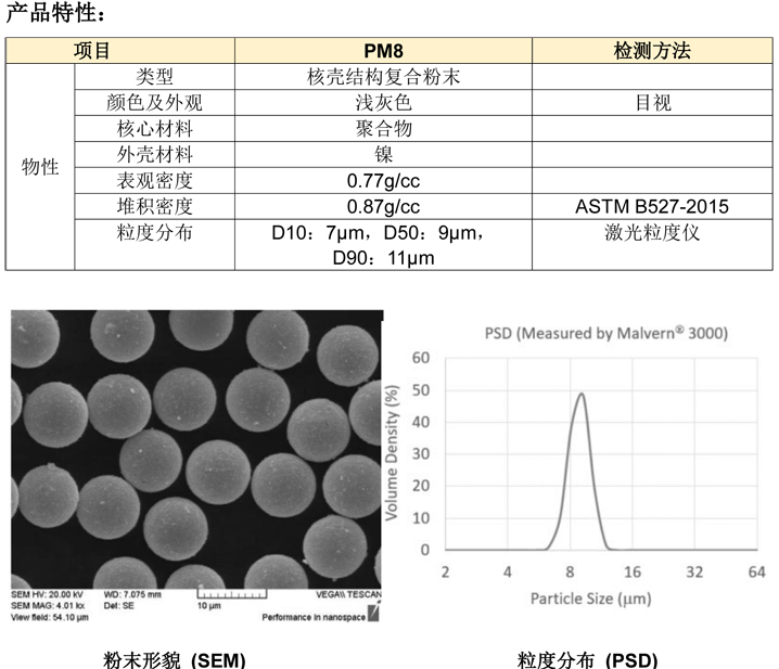 产品介绍:PM8为聚合物芯镍包粉,属于核壳结构复合粉末,具有高导电性、重量轻、单分散粒度分布等特点,一般用于各向异性导电膜/浆、导电胶粘剂、导电垫圈、导电填料等领域,产品外观为浅灰色。