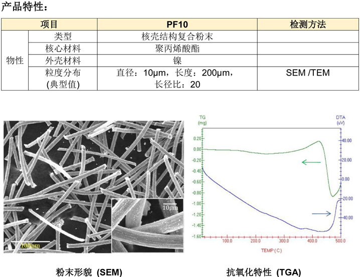 产品介绍:PF10为聚合物芯镍包粉,属于核壳结构复合粉末,具有高导电性、重量轻等特点,一般用于导电胶粘剂、导电垫圈、导热塑料等领域。
