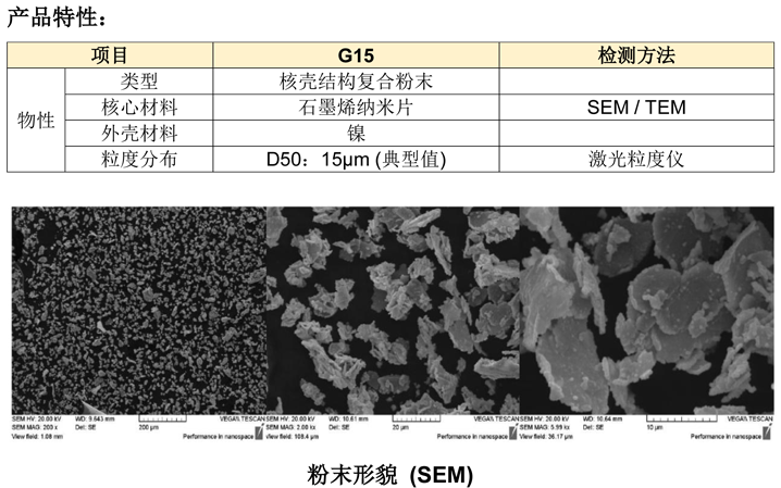 产品介绍:G15为石墨烯芯镍包粉,属于核壳结构复合粉末,具有高导电性、重量轻等特点,一般用于导电胶粘剂、导电垫圈、导热塑料等领域。G15的Ni含量最大可达石墨烯纳米片核心的20倍(典型值),可根据最终应用进行定制。