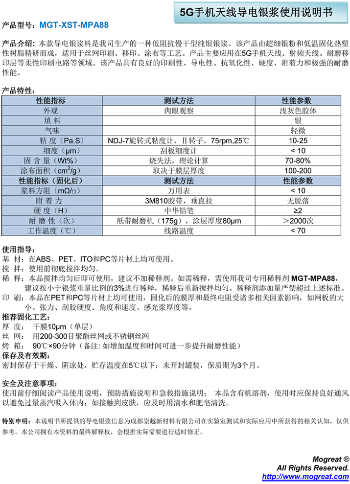 MGT-XTS-MPA88 导电银浆料是我司生产的一种低阻抗慢干型纯银银浆。该产品由超细银粉和低温固化热塑性树脂精研而成,适用于丝网印刷、移印、涂布等工艺。产品主要应用在5G手机天线、射频天线、耐磨移印层等柔性印刷电路等领域。该产品具有良好的印刷性、导电性、抗氧化性、硬度、附着力和极强的耐磨性能。