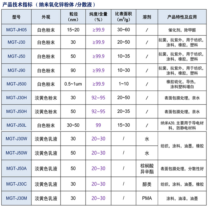 纳米氧化锌(分子式:ZnO, 分子量:81.37,CAS#: 1314-13-2),产品粒径小,纯度高,广泛应用于化妆品、纺织、陶瓷、橡胶、涂料、光催化、电子行业等领域。 我司大量供应纳米氧化锌粉体及其分散液。