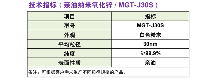 纳米氧化锌(CAS# : 1314-13-2)表面经亲油处理后与塑料、橡胶、油性涂料、油漆、胶黏剂以及其它油性树脂、油性溶剂等都具有良好的相容性,改善了纳米氧化锌的分散性能,使其与材料有更好的结合力。 同时纳米氧化锌产品活性高,是橡胶工业的无机活性剂和硫化剂,应用于油漆、油墨、涂料、塑料中可抗紫外,防老化,在陶瓷工业中可作乳蚀釉料的助熔剂。