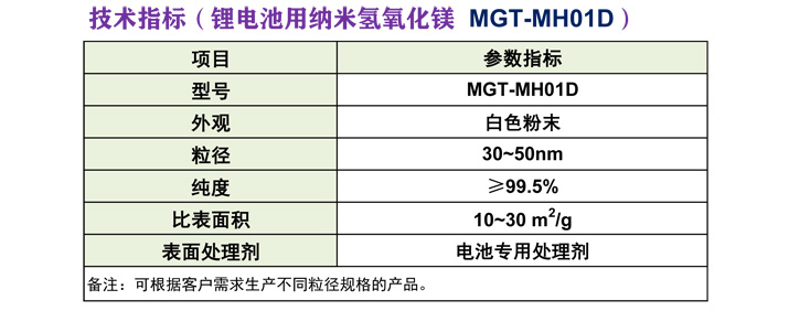 纳米氢氧化镁 ( CAS#:1309-42-8 ) 粒径小,活性高,广泛应用到用到锰酸锂,钴酸锂,磷酸铁锂,三元材料等锂电池正极材料。
