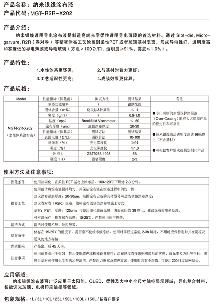 • 银纳米线透明导电涂布液(型号:MGT-R2R-X202)
